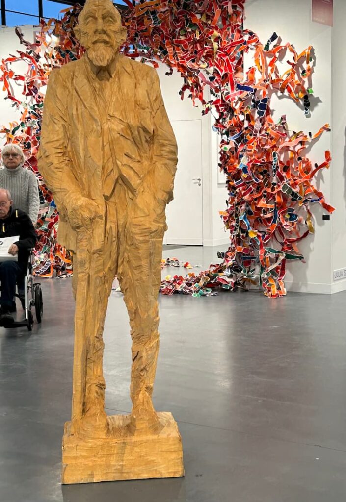 Depuis ses débuts, la sculpture est un élément marquant d’Art Karlsruhe, montrée dans des emplacements dédiés et dans les allées de déambulation. Tous les matériaux sont convoqués, la pierre avec Martin Hollebeck, l’acier avec Robert Schad, le textile avec les suspensions aériennes de Katharina Schnitzler, le bois avec les personnages grandeur nature de Josek Nowak, le fil de fer pour les silhouettes de Tamara Kvesitadze.