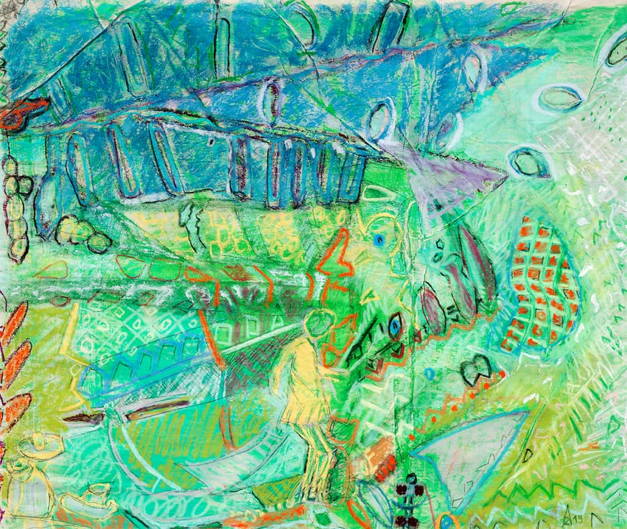 Mais depuis 4 ans, ses mains l’ont lâchées, alors elle peint autrement, heureusement, l’atmosphère est toujours là : les couleurs, l’ambiance, le temps qui passe… et n’en retenir que « l’abstraction de son quotidien. »