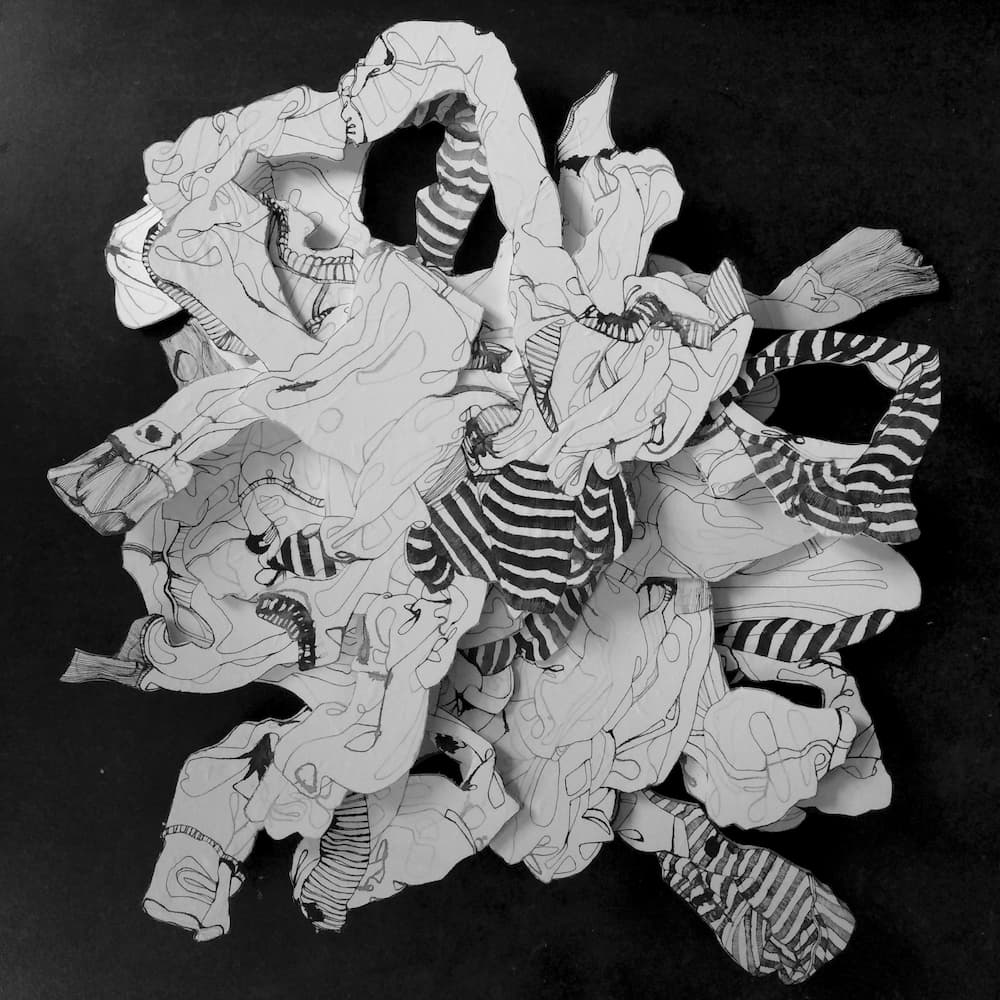 Je pratique également l’upcycling avec mes propres productions plastiques. Je réutilise dans mes dessins certaines formes créées pour mes installations éphémères. Je les retravaille, les redécoupe et elles retrouvent une place dans une nouvelle création. J’ai toujours plusieurs réserves de formes dessinées sur différents supports.