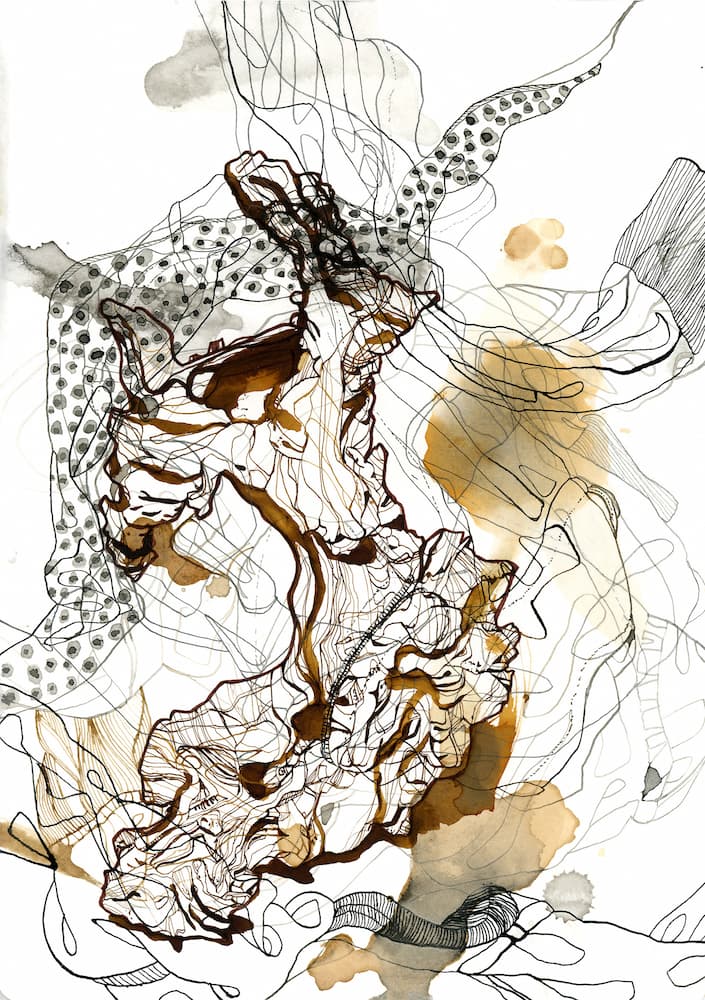 Les lignes cheminent dans l’espace de la feuille et cohabitent avec les taches d’encre et de café au hasard maîtrisé. Des formes se détachent, se chevauchent, vibrent entre elles, créant une dynamique mouvementée. Il y a la décomposition, l’éclatement et les découpages qui se détachent du support. Il y a la recomposition de l’existant répétée presqu’infiniment jusqu’à transfigurer le modèle en paysages imaginaires. A mi-chemin entre abstraction et figuration. Il en découle un univers complexe et pourtant plein de légèreté. »