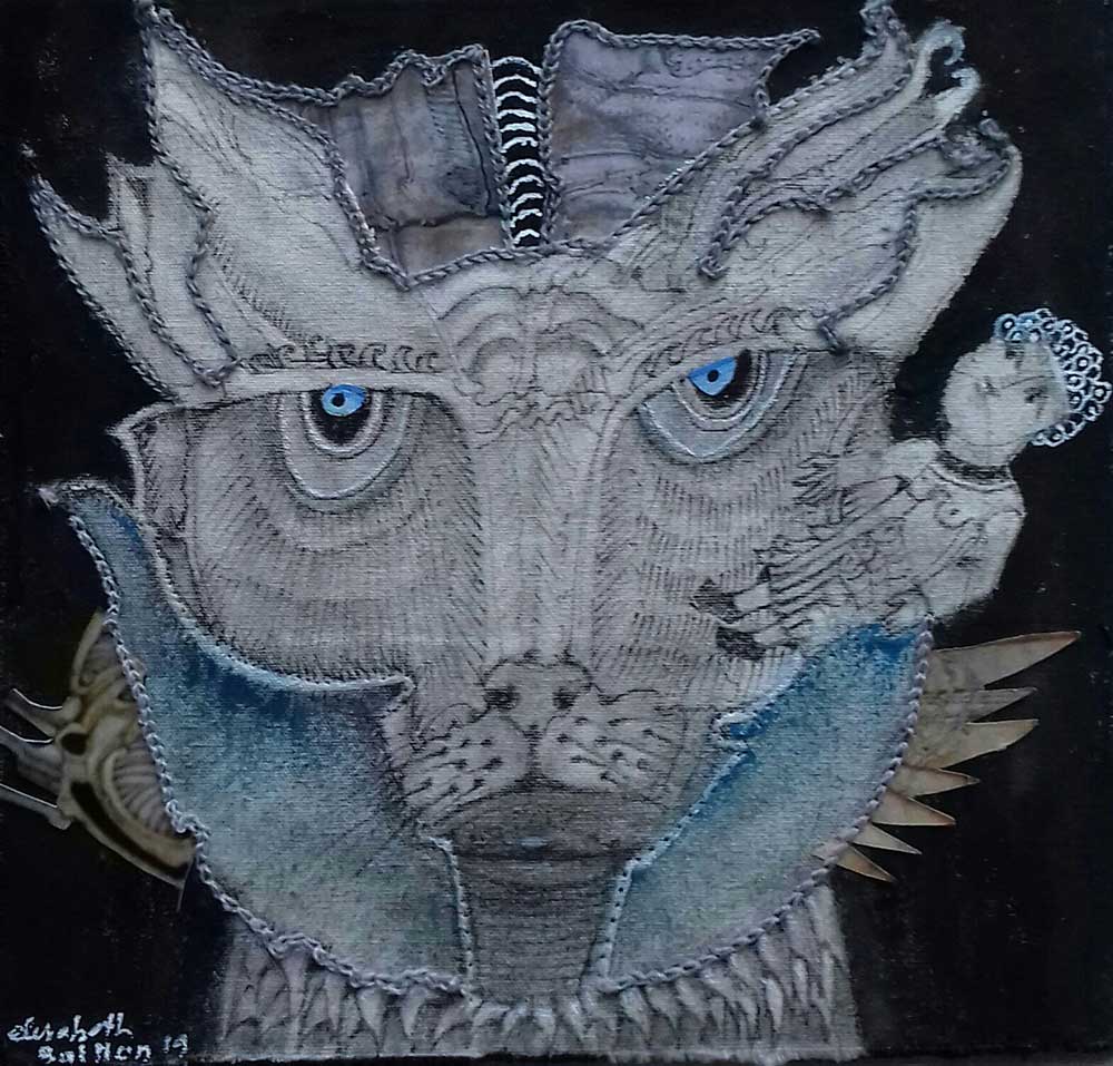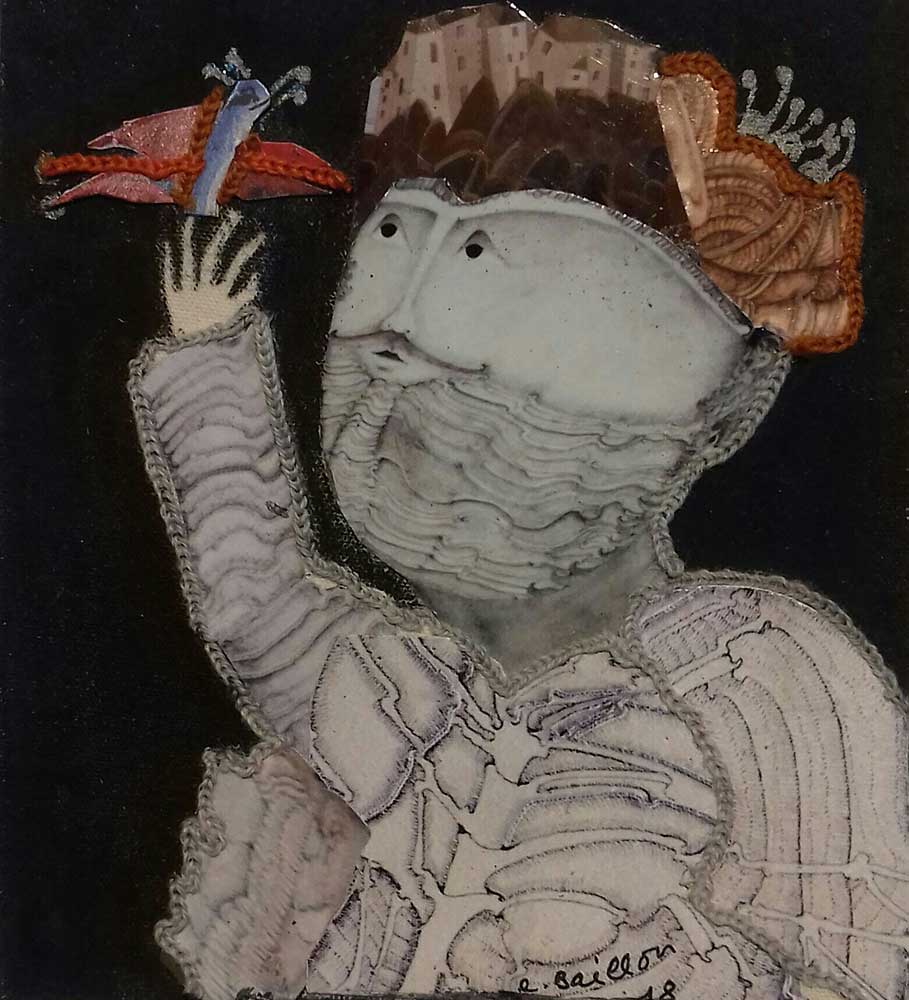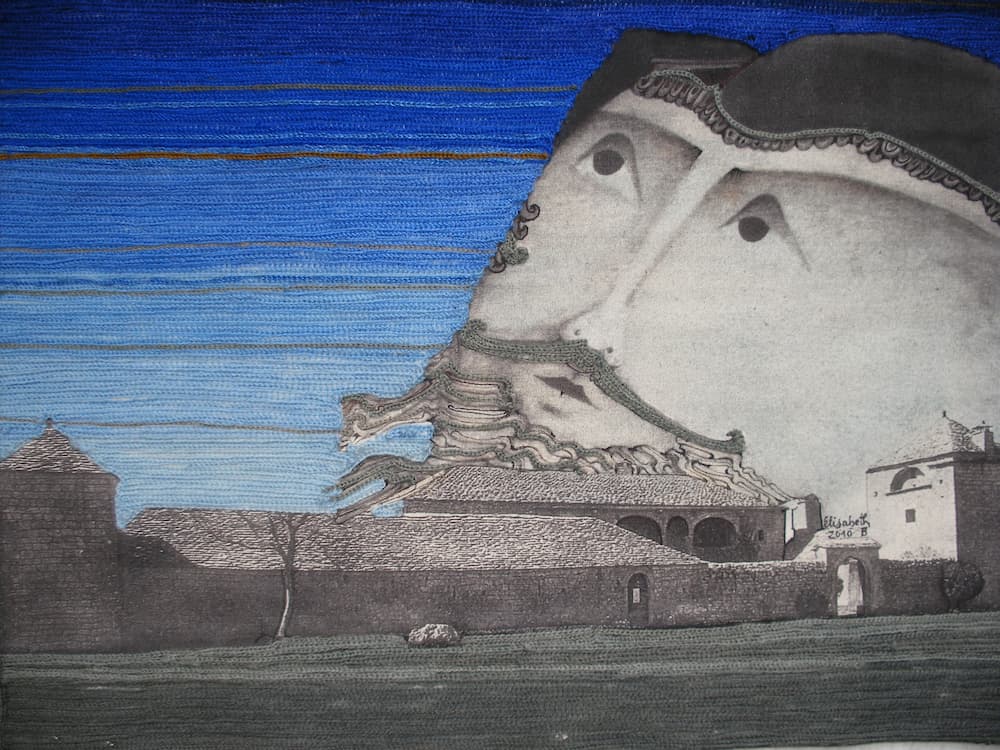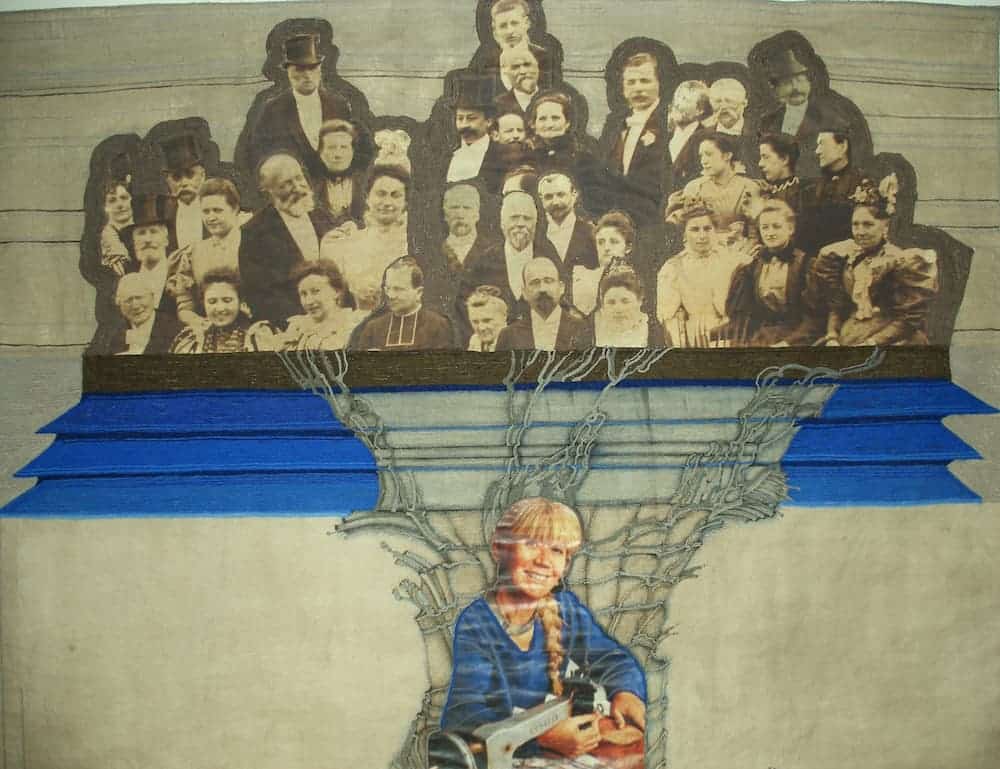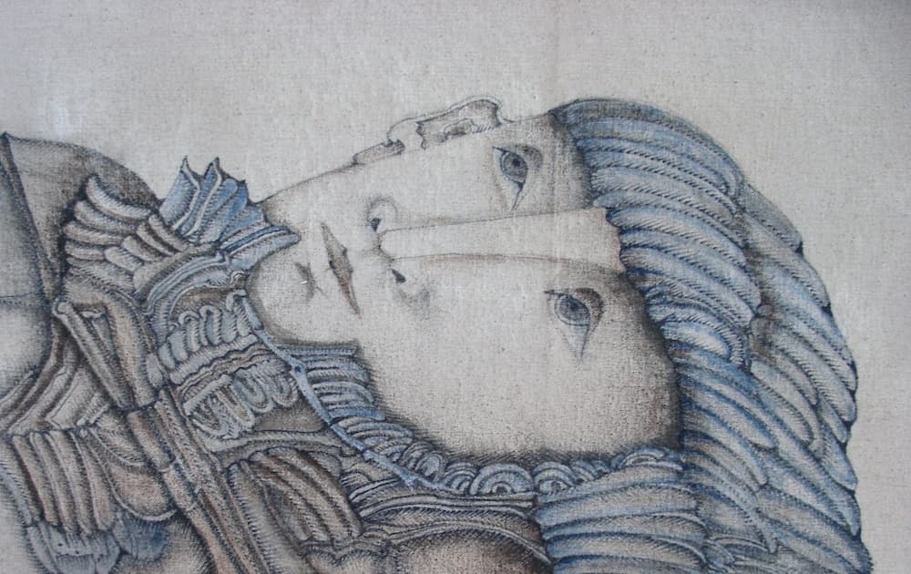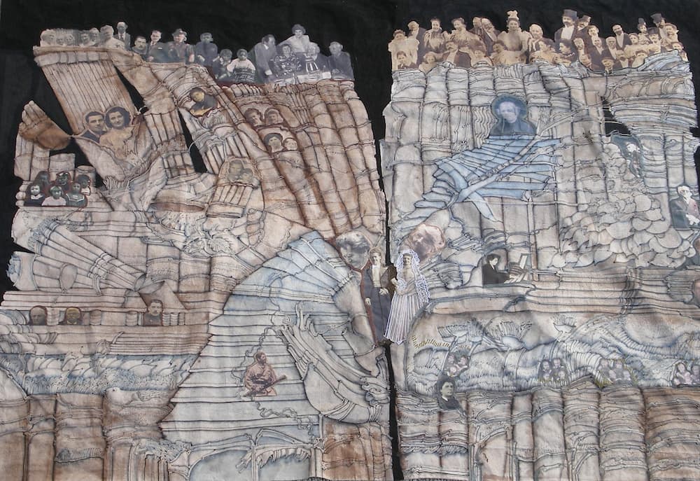 Ce voyage dans le noir dura trente cinq ans. Vint alors le désir de révéler le dessin recouvert. D’allier, sur un même territoire, la structure et la matière, l’os du dessin et la chair de la laine. Partir d’un tissu blanc, apprivoiser sa blancheur d’hostie, la tacher d’encres. Cela déborde et capilarise sans discipline, se métamorphose en douce. Le dessin surnage, puis il est ombré et griffé comme une sorte de tatouage à la plume. La chaînette entoure cette ossature, elle la borde et la brode de sa matière laineuse, en respecte dorénavant les contours. Puis, des photos sont transférées sur le tissu : visages des êtres chers disparus de l’enfance, retrouvés ainsi sur la toile.