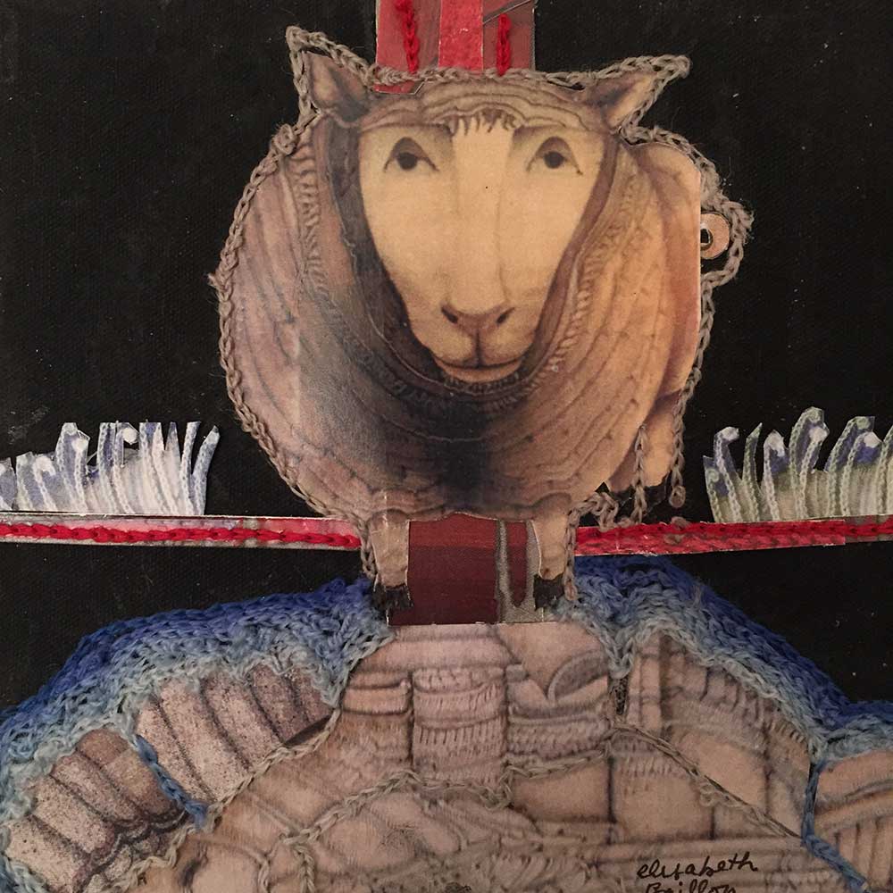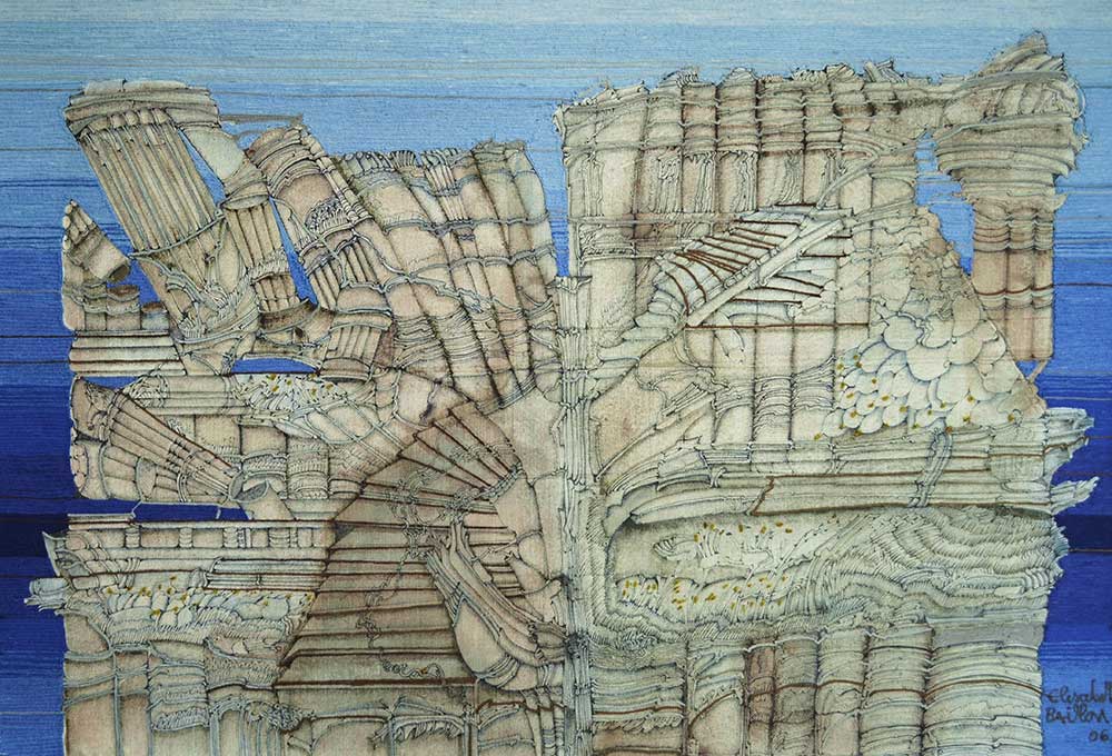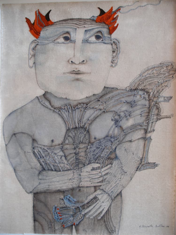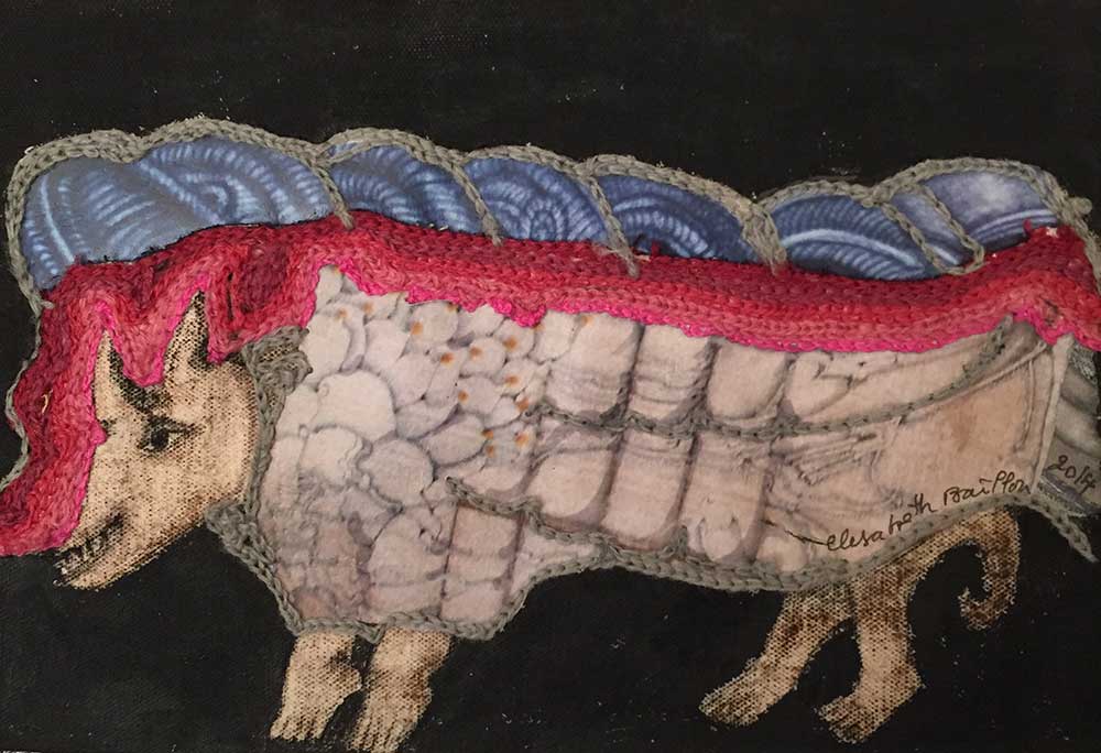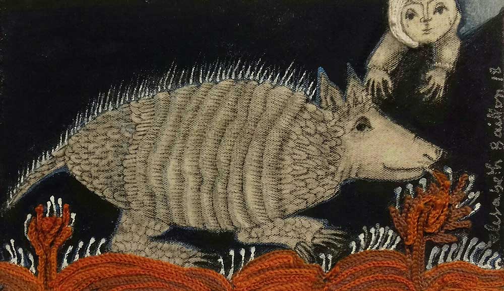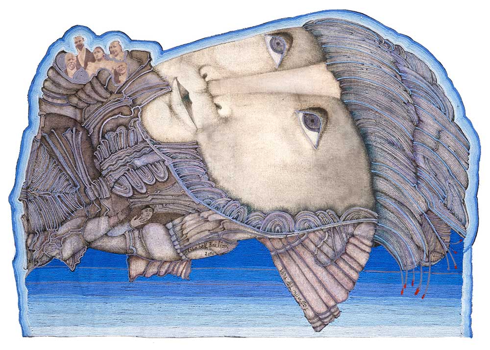 Ce voyage dans le noir dura trente cinq ans. Vint alors le désir de révéler le dessin recouvert. D’allier, sur un même territoire, la structure et la matière, l’os du dessin et la chair de la laine. Partir d’un tissu blanc, apprivoiser sa blancheur d’hostie, la tacher d’encres. Cela déborde et capilarise sans discipline, se métamorphose en douce. Le dessin surnage, puis il est ombré et griffé comme une sorte de tatouage à la plume. La chaînette entoure cette ossature, elle la borde et la brode de sa matière laineuse, en respecte dorénavant les contours. Puis, des photos sont transférées sur le tissu : visages des êtres chers disparus de l’enfance, retrouvés ainsi sur la toile.