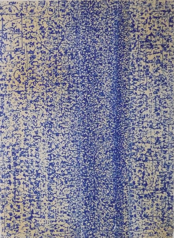 C’est particulièrement sur cette perception de l’infini que je travaillais depuis plusieurs années avec des oreilles flottantes, des osmoses, des blancs de silence, des bleus intenses, puis par des graphismes, des écritures incompréhensibles pour extrapoler les lois cosmiques, puis les mathématiques s’imposèrent, car depuis l’Antiquité c’est par eux que les humains traduisent ce qu’ils découvrent de l’Univers. La plaque gravée et tirée pouvait à nouveau être retravaillée et tirée et je voyageais ainsi dans l’espace…