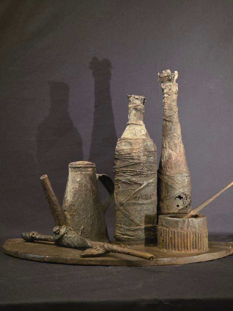 « J’enferme dans mes boites, ou dans le bronze ….ficelles, objets, fragments de manuscrits, livres, joue avec leurs mémoires, et leur invente un itinéraire au passé anonyme, diverses étapes d’une vie …. De nos vies. »