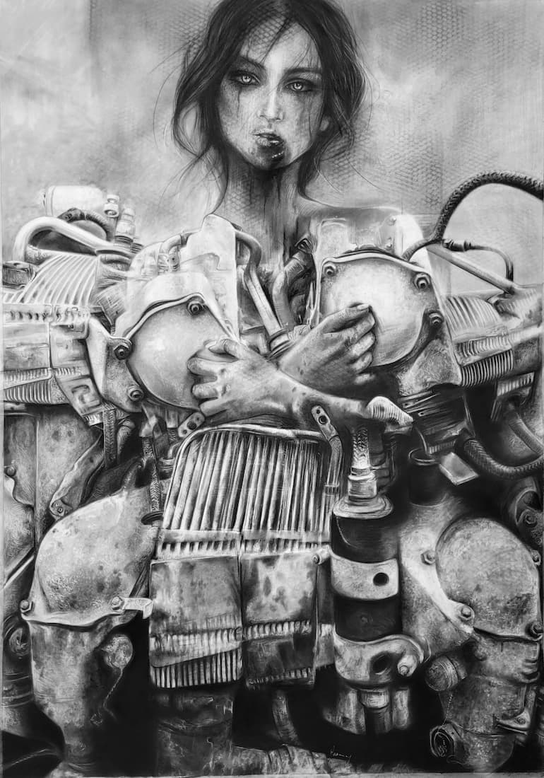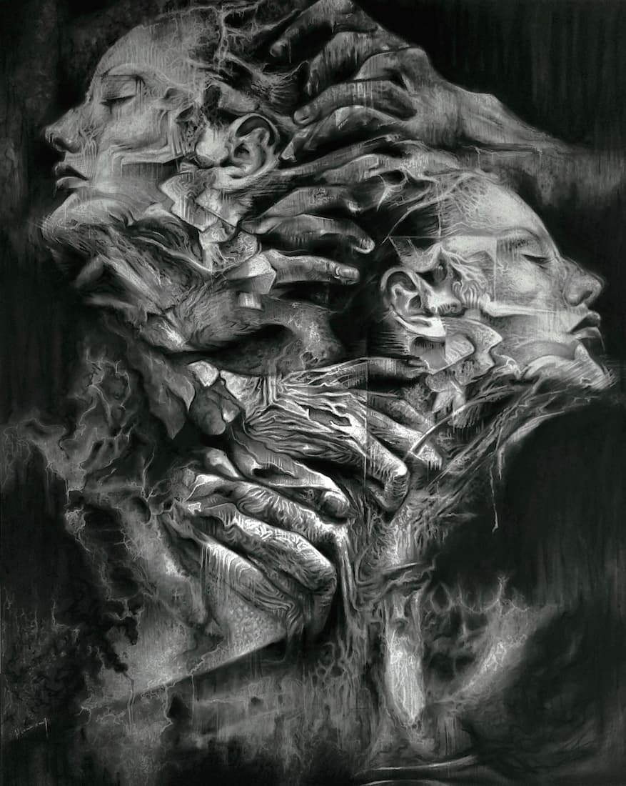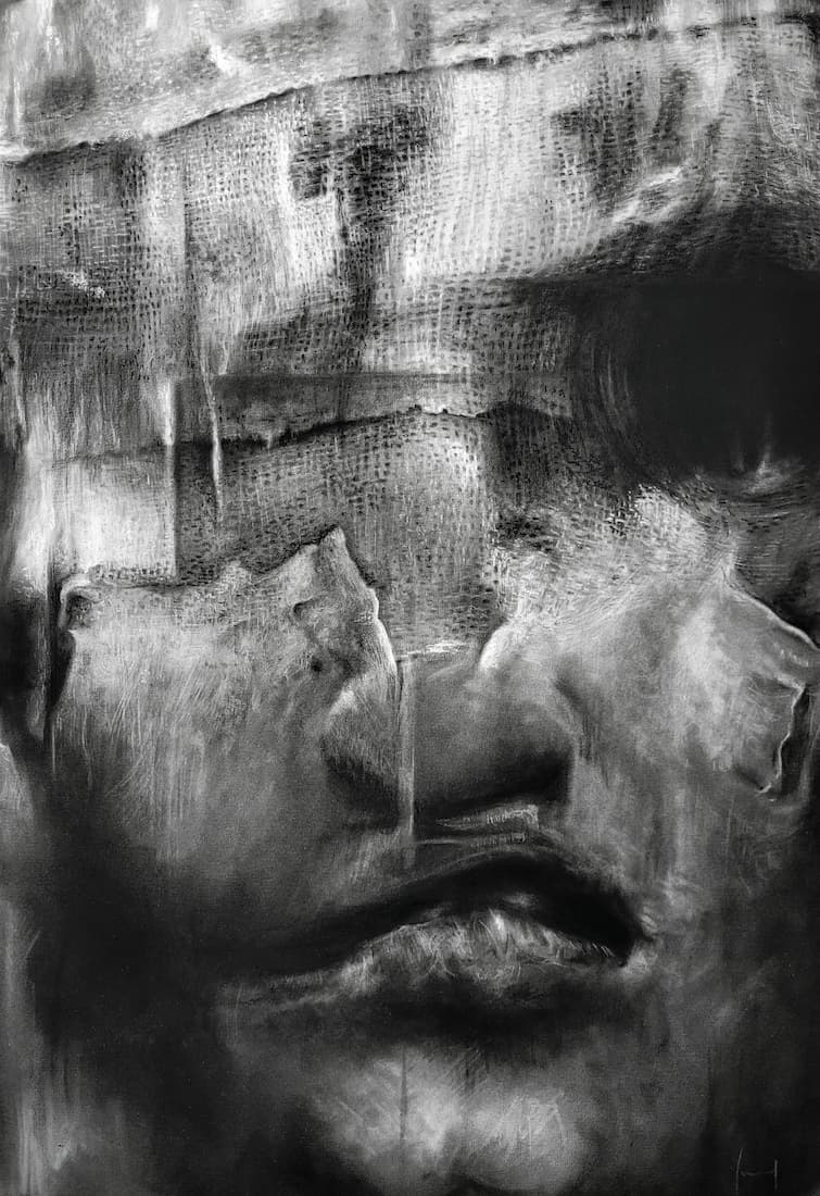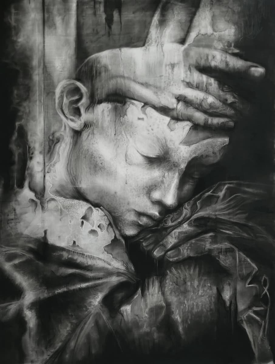 Je m’inspire de ce qui m’entoure : une actualité qui me bouleverse, un fragment de passé, ce que j’estime être injuste, mes peurs, mes traumatismes. Je conçois la création comme une forme de thérapie : je vis le bonheur au quotidien, mais j’exorcise mes blessures à travers l’art. J’observe le monde et le manque d’humanité actuel avec beaucoup de noirceur, tout en restant sensible aux petits gestes de tendresse. C’est pour cela que, dans chaque œuvre, je suis toujours en quête d’une forme de beauté qui émerge du chaos ; comme un signe d’espoir, une bouée à laquelle m’accrocher.