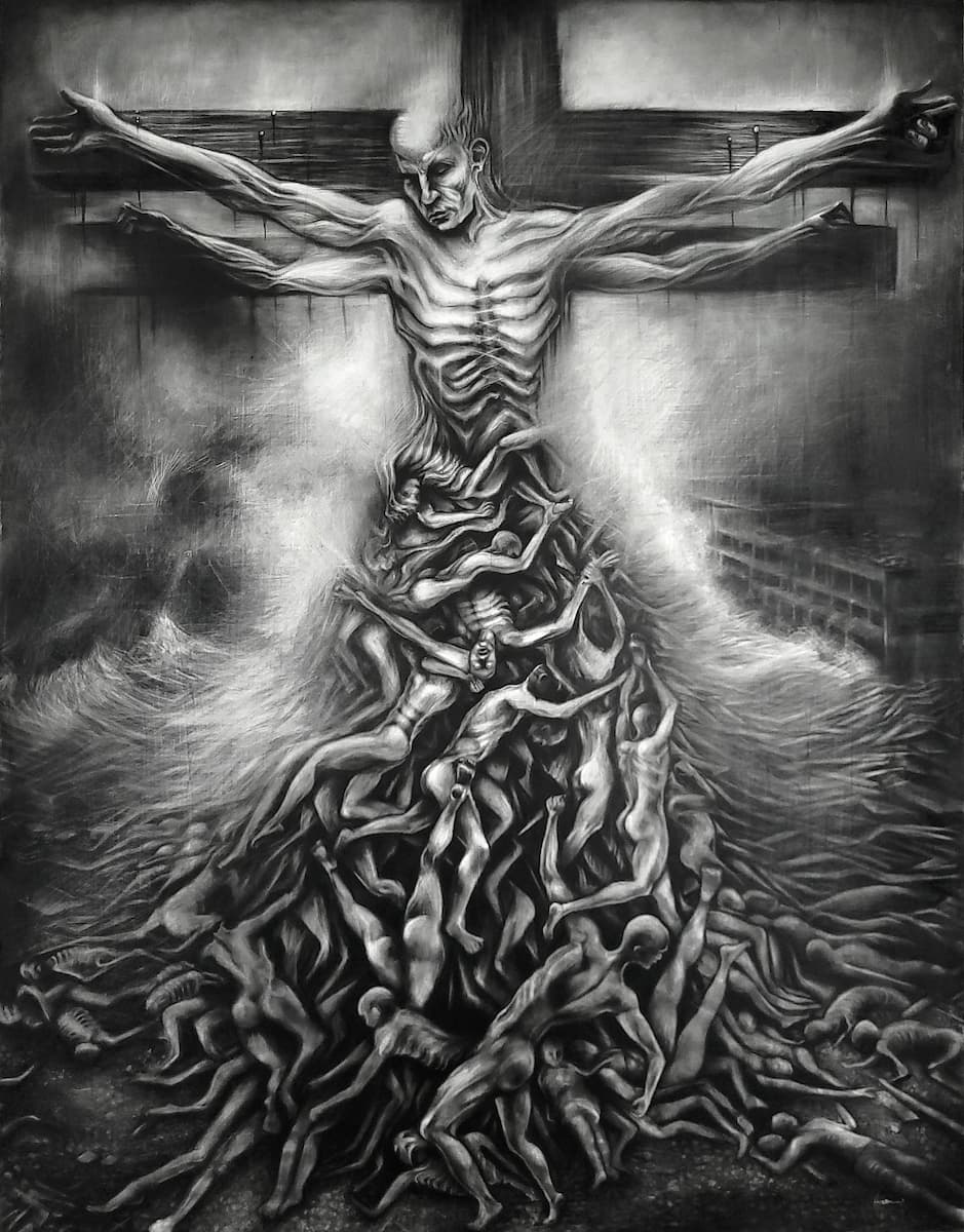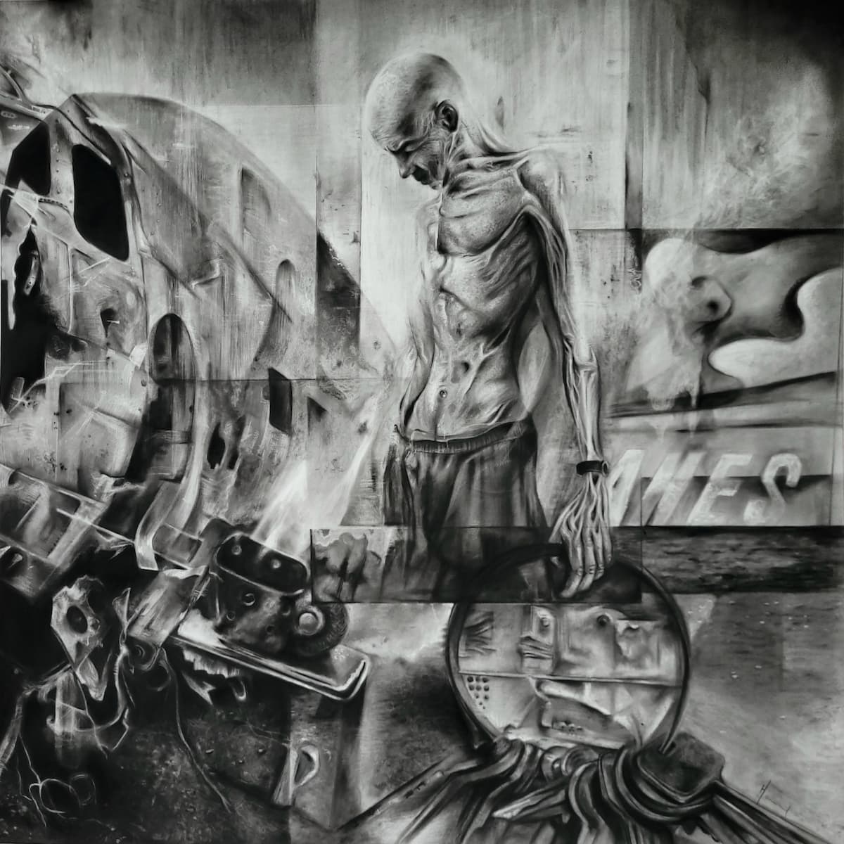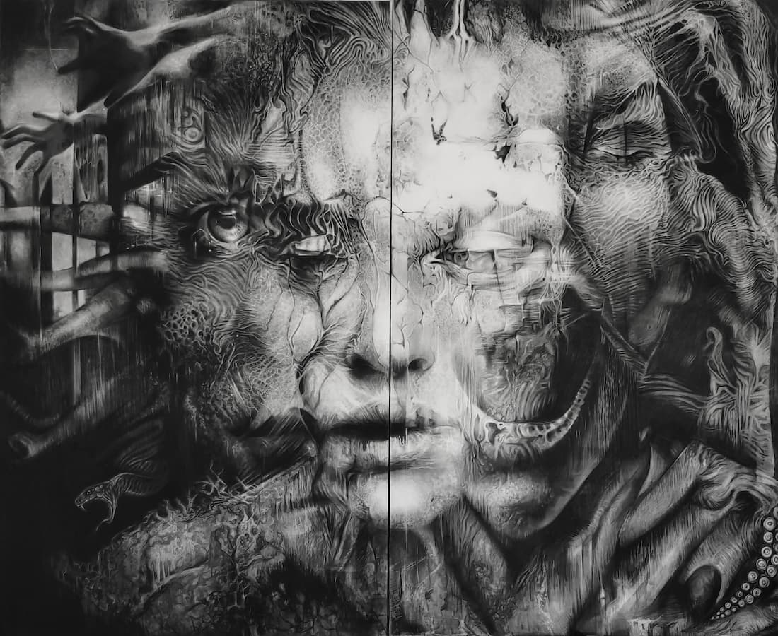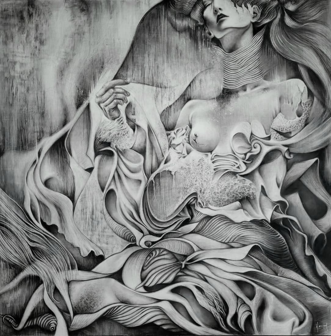 Je m’inspire de ce qui m’entoure : une actualité qui me bouleverse, un fragment de passé, ce que j’estime être injuste, mes peurs, mes traumatismes. Je conçois la création comme une forme de thérapie : je vis le bonheur au quotidien, mais j’exorcise mes blessures à travers l’art. J’observe le monde et le manque d’humanité actuel avec beaucoup de noirceur, tout en restant sensible aux petits gestes de tendresse. C’est pour cela que, dans chaque œuvre, je suis toujours en quête d’une forme de beauté qui émerge du chaos ; comme un signe d’espoir, une bouée à laquelle m’accrocher.