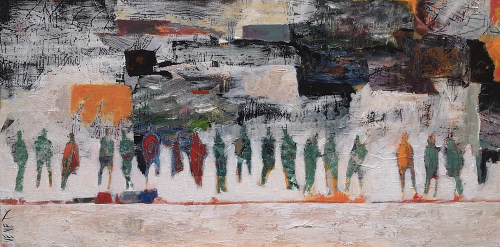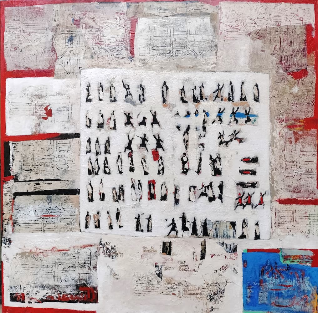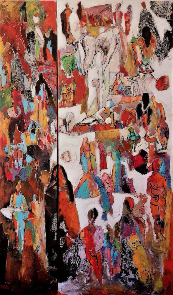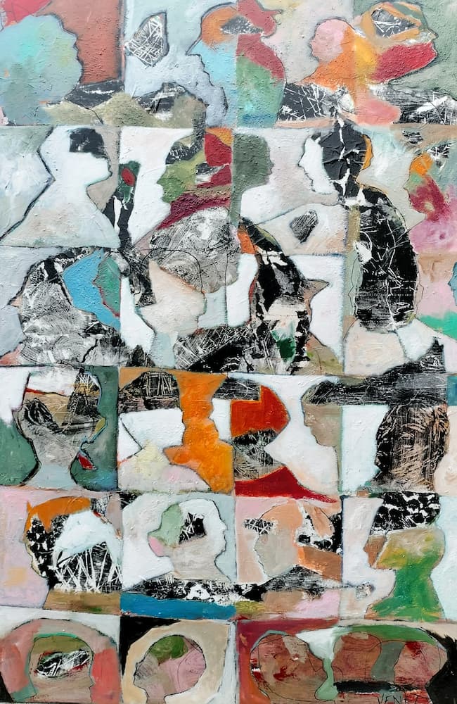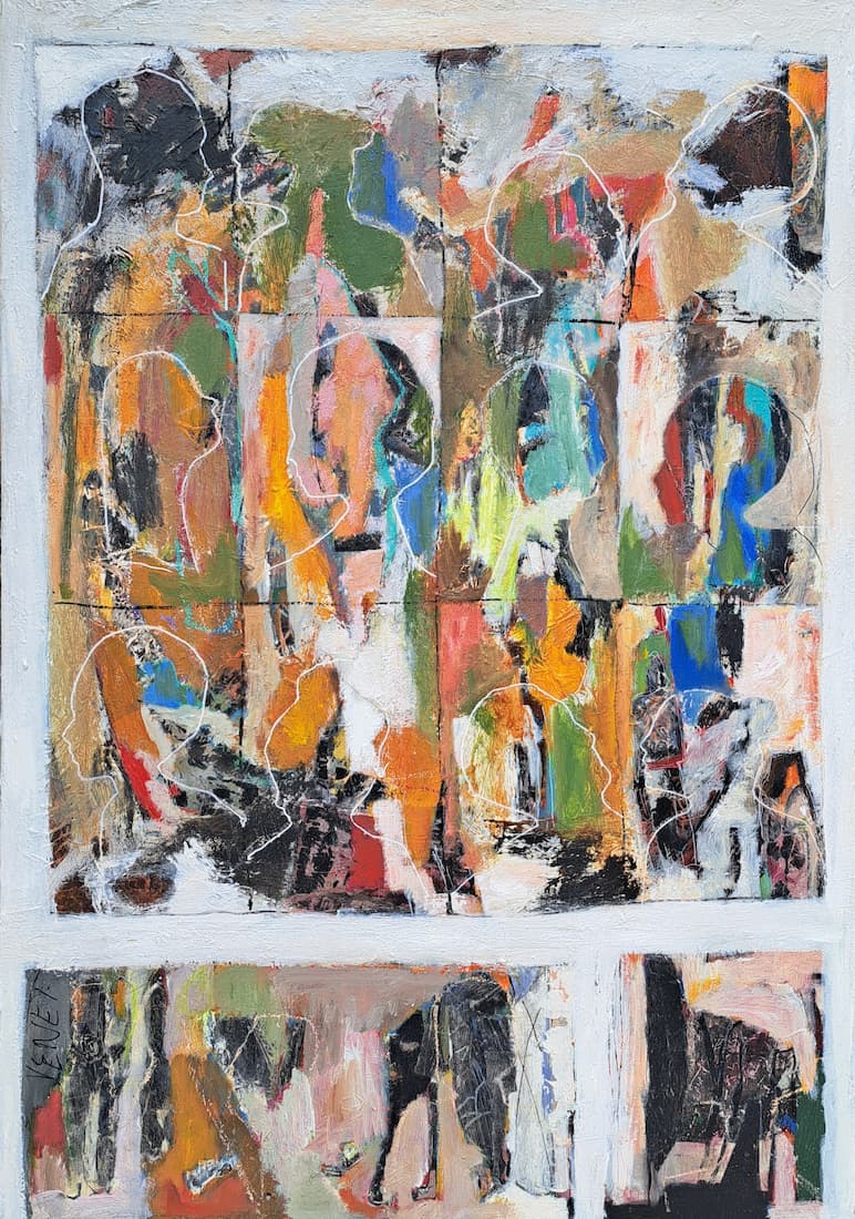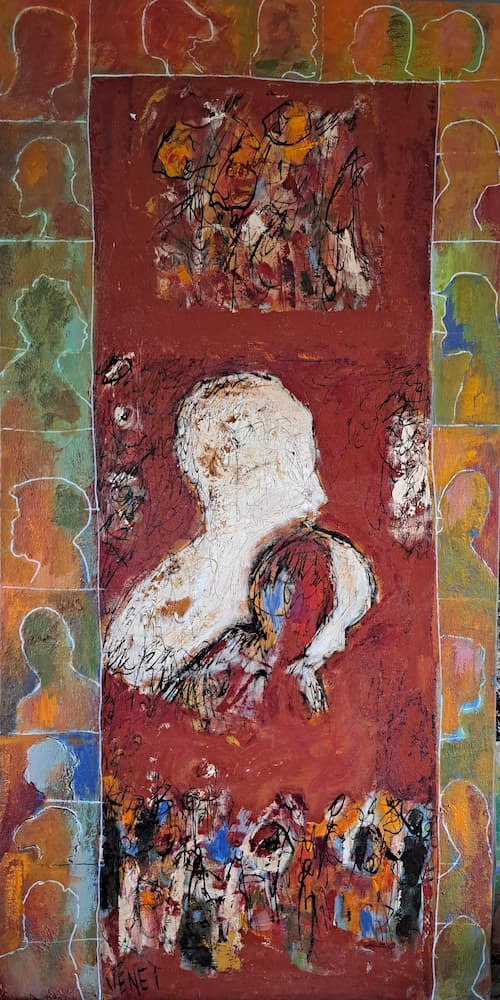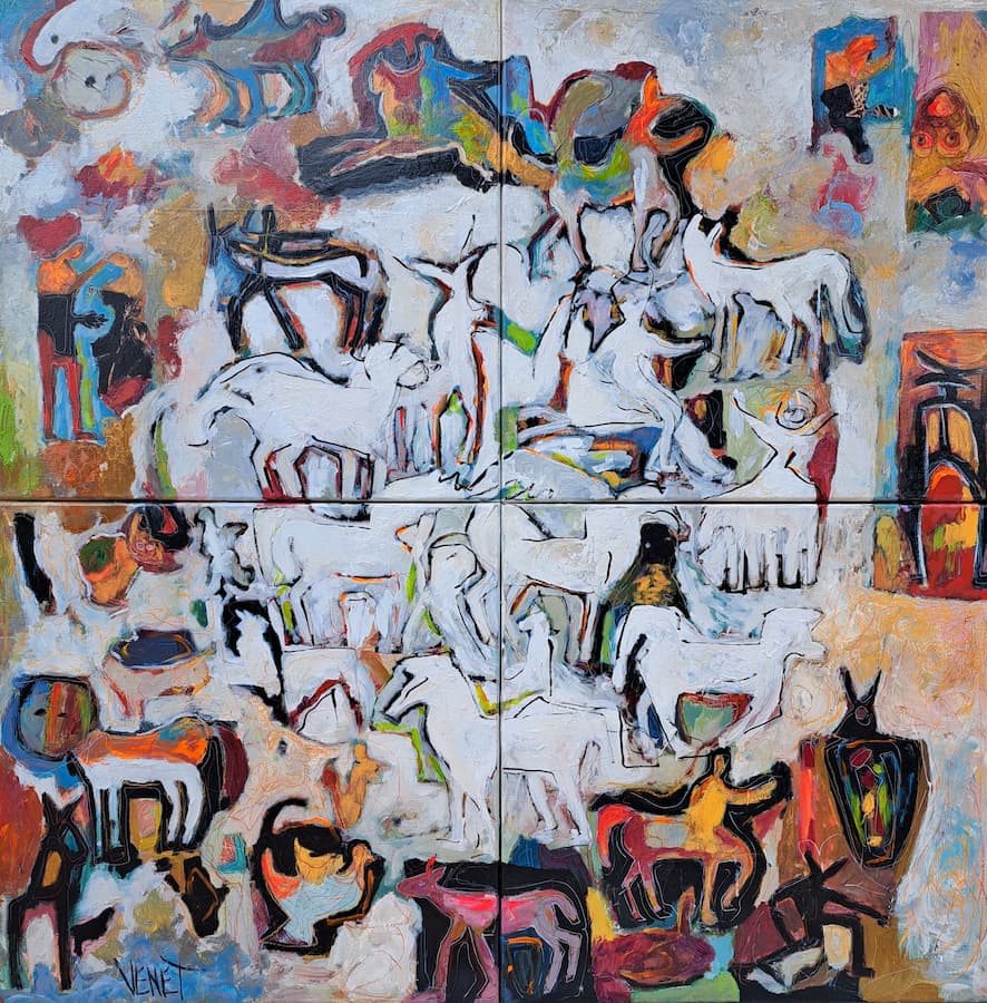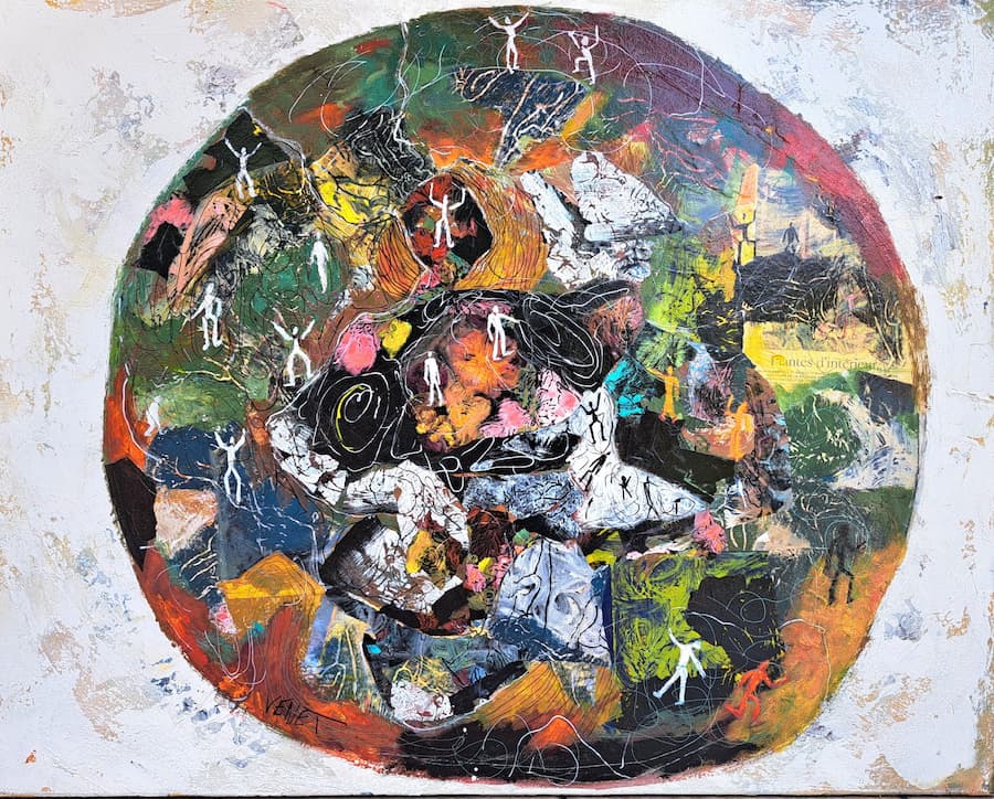 Pérégrinant entre l’Afrique, l’Asie et l’Europe, naviguant sur la multiplicité des peuples et de leur culture, traversant les époques de celles où l’homme gravait encore sur le roc les traces de son passage à celle des avions et des trains, les œuvres d’Isabelle Venet reflètent son cheminement intérieur qui se fait par son regard sur les mondes extérieurs. Ainsi, la peintre transcende toutes les frontières qu’elles soient géographiques, spirituelles, culturelles, temporelles, identitaires mais aussi artistiques. Vagabondant entre abstrait et figuratif, les œuvres matiéristes d’Isabelle Venet présentent un caractère primitif et spontané. L’art brut doit « naître du matériau (…), se nourrir des inscriptions, des tracés instinctifs (…) » écrivait Jean Dubuffet. Son travail intuitif est cependant soutenu par des techniques, des compositions et une démarche plastique élaborées.