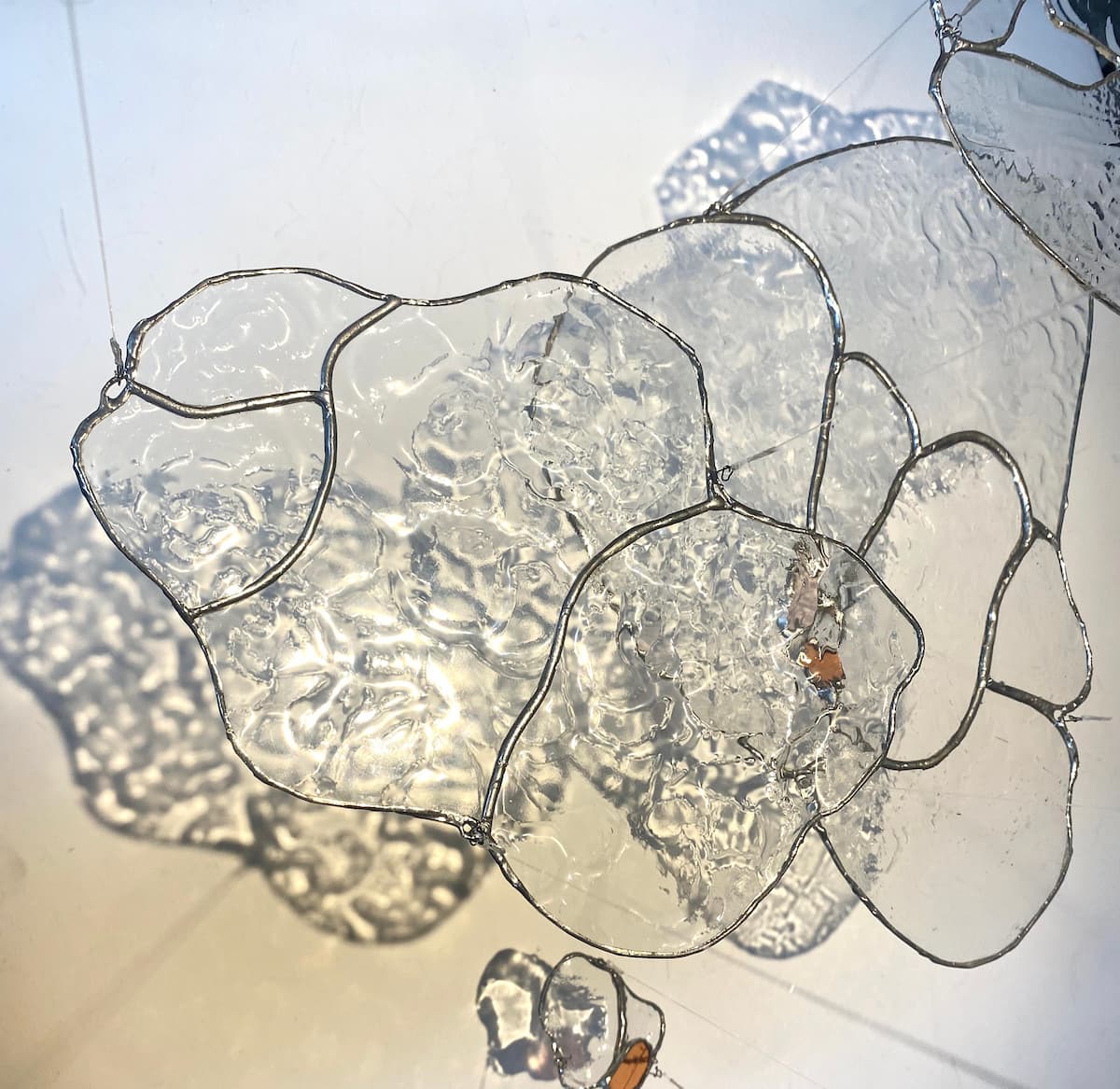 Matière-lumière, j’explore la capacité des vitraux et du verre à cristalliser la lumière et le temps, en inscrivant une forme fixe dans la matière en même temps que fluide et variant au gré des jours par la lumière. Au-delà du plan en deux dimensions, je les déploie dans des structures en volume, privilégiant l’interaction avec l’espace dans lequel elles s’inscrivent.