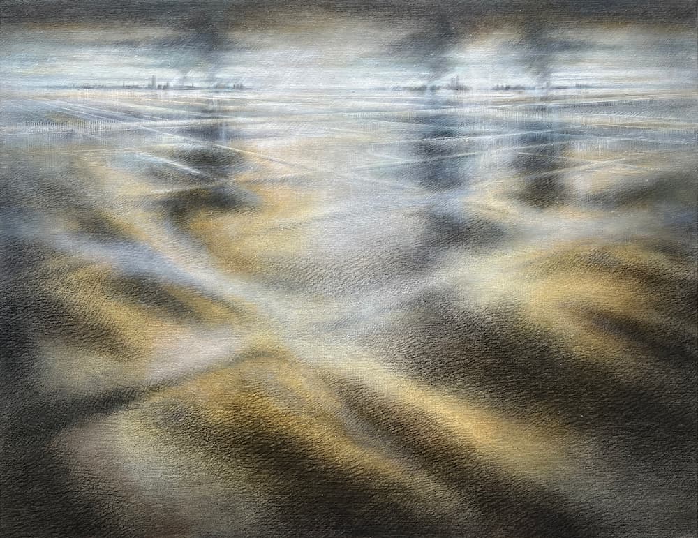 Le support, qu’il s’agisse de toiles ou de papiers, est choisi pour sa capacité à accueillir un paysage ouvert et suggestif. La présence d’eau est un thème récurrent et la préoccupation de l’artiste. Brume, glacier, consistance de l’air, occupent les paysages. Et puis la terre vue depuis quelque hauteur, la cartographie de quelque ville traversée par mille veinules qui font à la surface du globe des entrelacs compliqués, où le regard s’invente d’improbables itinéraires.