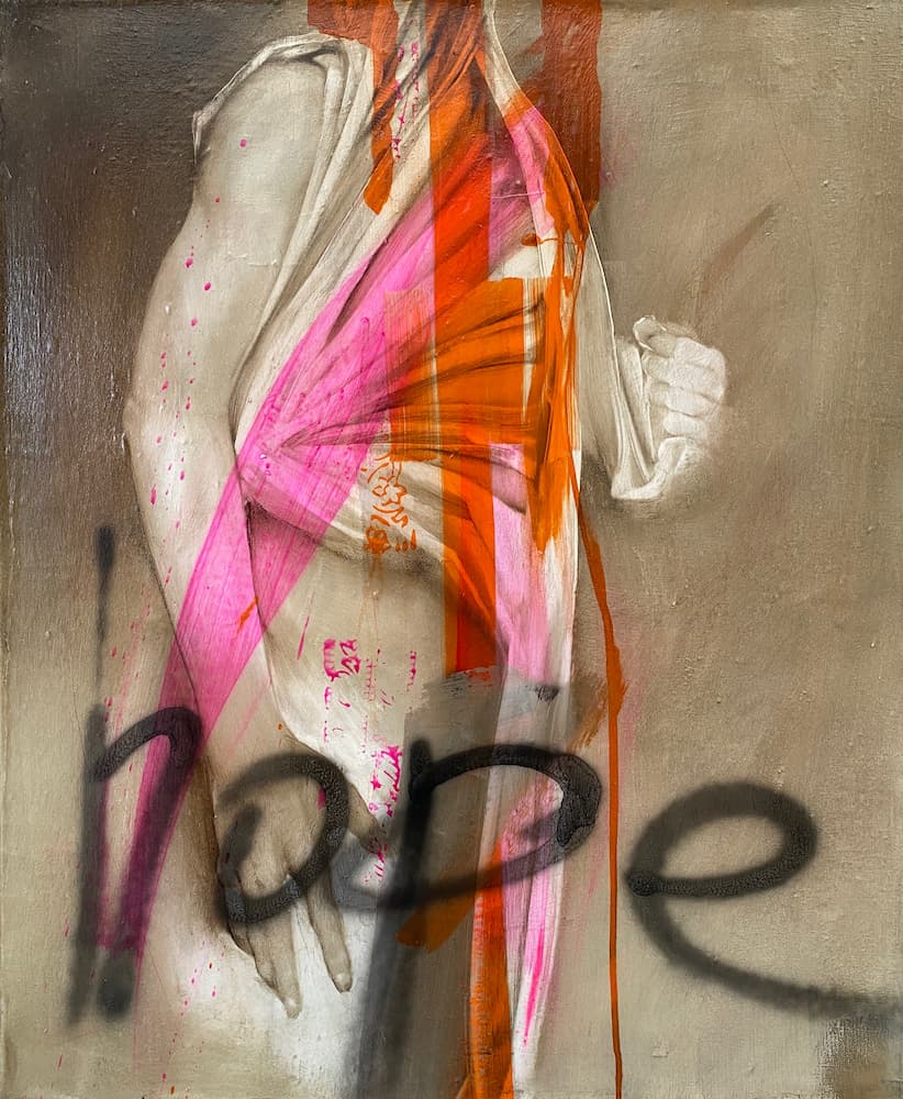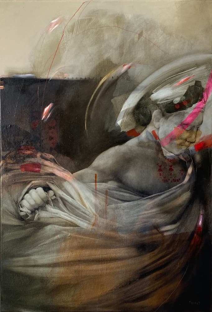 Ainsi, le fil de la création qui s’en vient est l’apparition de ce corps. La musique m’accompagne en fond sonore. Je m’arrête devant la toile couverte de ses premières couches et je regarde. Je cherche ce qui en émane et rapidement je vais fouiller la surface. Je pose la matière, j’essuie, je recommence jusqu’à découvrir ce qui se cache à mes yeux. Le corps semble en mouvement sur la toile, se tournant et retournant parfois longtemps, jusqu’à ce qu’enfin il s’immobilise. Alors à travers cette figuration je questionne, je cherche le sens, je la veux parlante et s’adresser au regard de l’autre afin de décrypter son propre mystère.