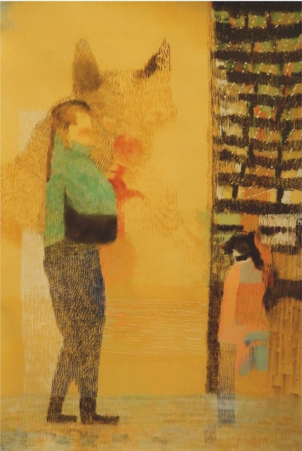 Je suis attirée par les petites choses modestes. Mon univers c’est le ténu, l’insaisissable, l’indistinct, ce qui échappe, impossible à saisir et à définir. Comment rendre la transparence d’une lumière, éphémère, l’air qui bruisse et vibre autour d’une figure, humaine ou animale qui passe et disparaît. Créer c’est aussi pour moi la seule méthode à ma disposition pour essayer d’exprimer mon «intranquillité et de comprendre le monde, son inquiétante fragilité et celle des êtres vivants. L’huile, le fusain, la gouache, le crayon noir ou de couleur sont les matériaux que je privilégie. J’applique la matière en couches superposées, plus ou moins fines, pour rendre tangible la vibration des êtres et des éléments. Je ne cherche pas à rendre compte d’une réalité et ma peinture, bien que figurative, laisse la place au doute et à l’interprétation de celui qui regarde.