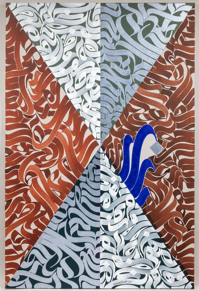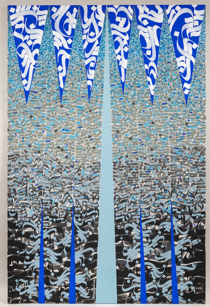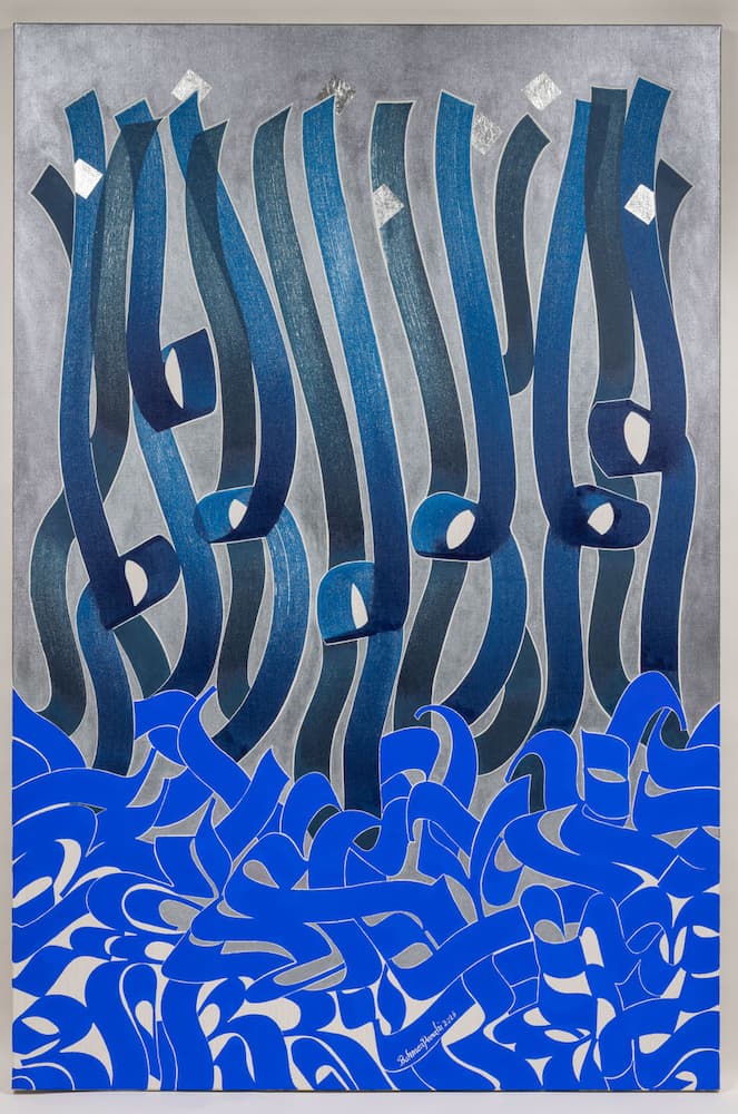 Pour cette exposition, la commissaire Golzar Yousefi a invité l’artiste plasticien franco-iranien Bahman Panahi, maître calligraphe, musicien et créateur du concept « Musicalligraphy« , une exploration des relations entre structure musicale et composition visuelle dans l’art calligraphique. Bahman Panahi pratique depuis toujours l’exigeante discipline de la calligraphie, il connaît la poésie et la philosophie persanes, et le langage du soufisme lui est présence familière.