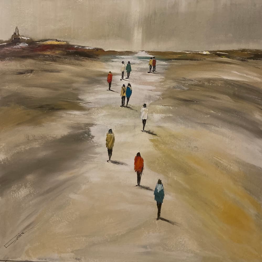 Le travail de Chantal Grès se distingue par ses figures minimalistes, de petites silhouettes fluides et mouvantes qui semblent capturer l’essence même de nos instants suspendus. Sans traits précis ni détails superflus, ces personnages universels deviennent des miroirs pour nos propres émotions. Qu’elles évoquent une scène de vie ou un moment d’introspection, ses créations suggèrent plus qu’elles ne montrent, laissant à chacun la liberté d’imaginer sa propre histoire au fil de la toile.