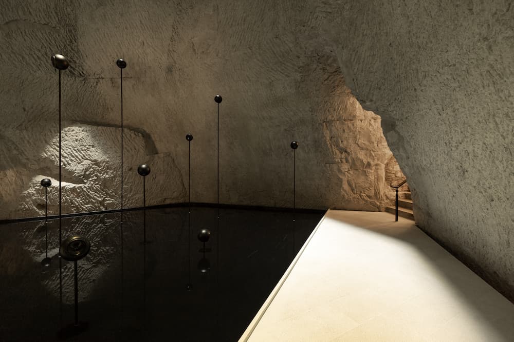 En visitant le 4 rue des Crayères, adresse historique de la Maison Ruinart à Reims, Julian Charrière a imaginé cette installation dans les immenses caves de craie façonnées par les vestiges d’une mer du Crétacé. L’installation fait résonner la craie, une roche issue des sédimentations fossiles d’océans disparus, avec un paysage sonore et des nappes de lumière qui ondoient sur les parois.