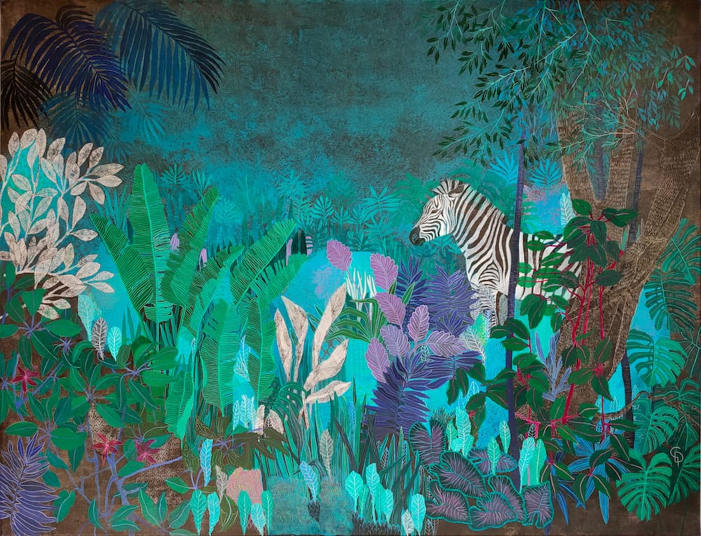 À travers une sélection de paysages et de portraits, l’artiste nous transporte dans un monde de silence et de nostalgie. Dans ses séries L’heure bleue ou Véranda, des animaux sauvages évoluent paisiblement au cœur de jardins endormis, transformant chaque toile en un instant suspendu. Ses portraits, empreints de dentelle et de fleurs, explorent la richesse de l’âme et la fragilité du corps avec une délicatesse infinie.