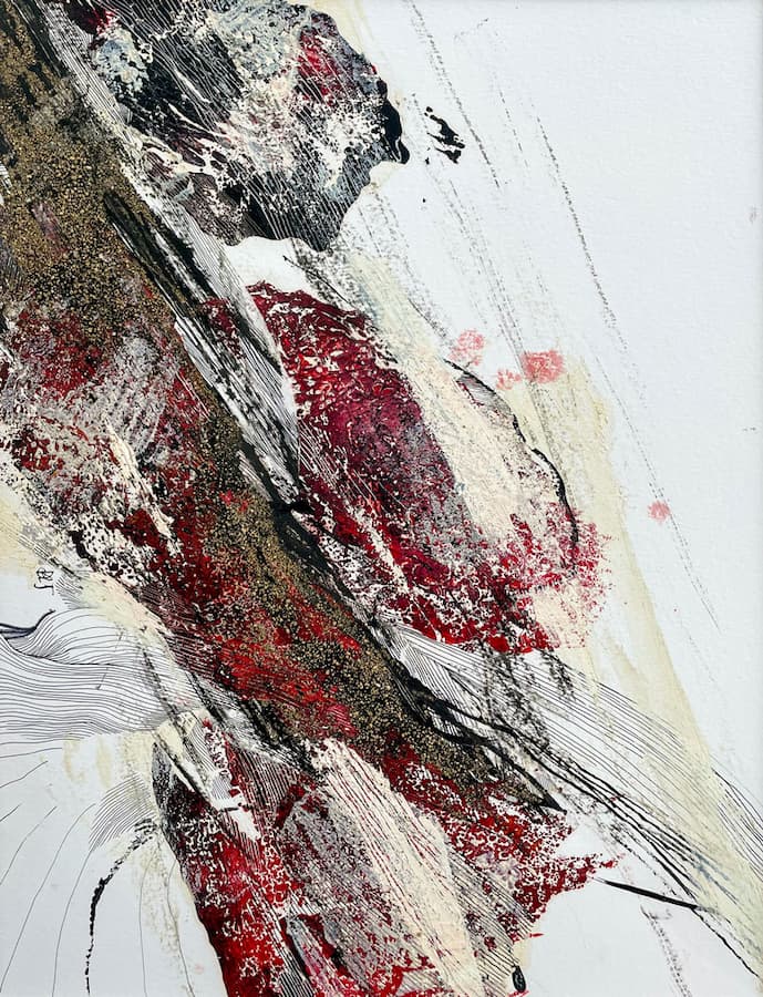 Dans cette exposition, le papier est mis à l’honneur comme un vecteur de la pensée et de la mémoire. Éric Dabancourt laisse le pigment topographier ce support, créant des cicatrices de la terre qu’il a foulée. Ses œuvres racontent les silences et les cris de l’artiste, invitant à une proximité intime et délicate.