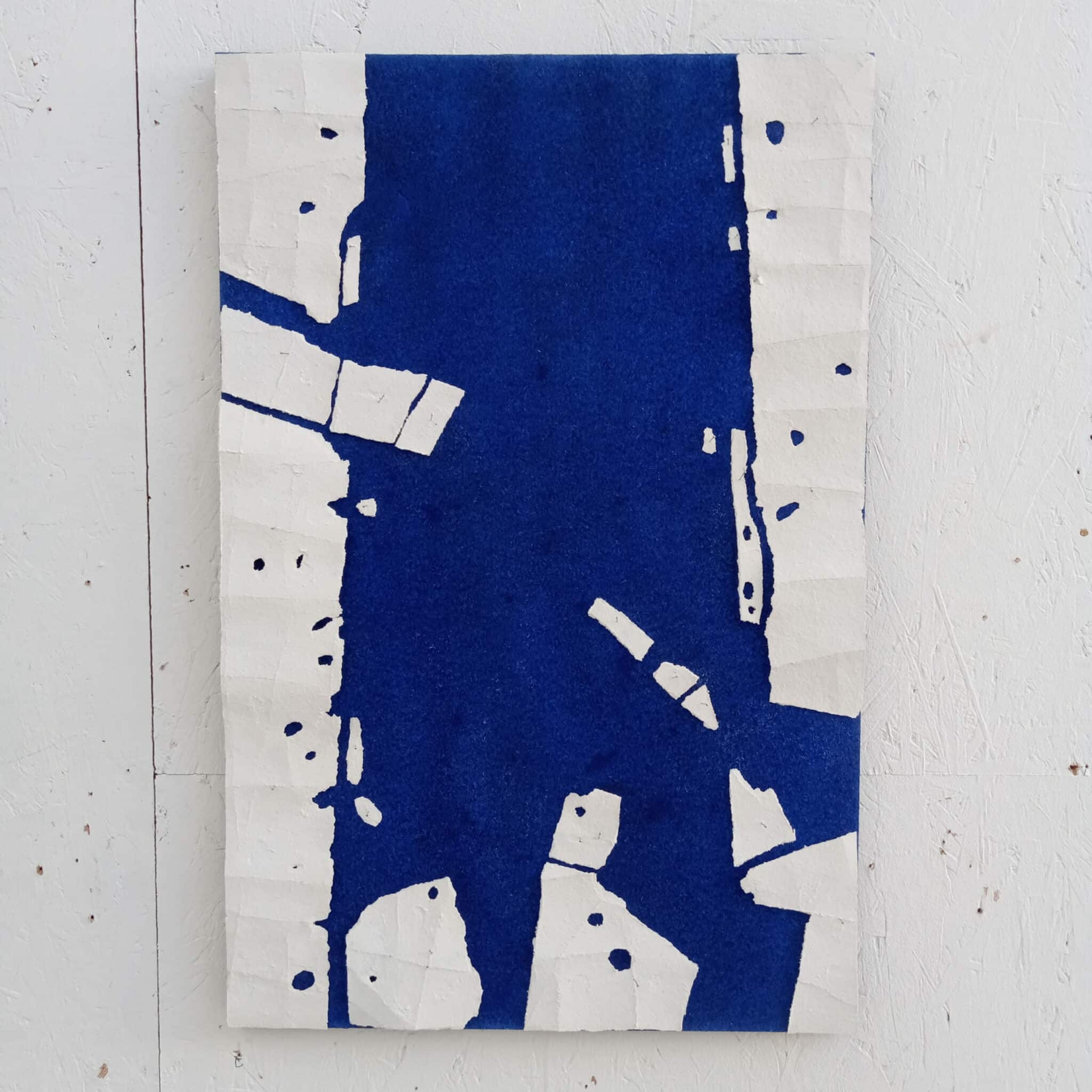 AD : La fonte des glaces est un phénomène naturel qui représente un inquiétant problème pour la planète, mais je dois dire que les fractures générées par cette fonte sont visuellement magnifiques et c’est ce qui m’a incité à en parler. Dans mon travail, j’utilise le carton bois ou carton plat depuis une quarantaine d’années. Ce type de carton est fait de plusieurs couches de papiers superposées. En le délitant, des tranches de plus en plus fines se sont formées. Je les compose de différentes façons, et m’intéresse à la multiplicité des dessins qui mettent en lumière le rapport de l’eau (bleu) et de la glace (blanc). Si les Foudroyés sont conçus comme des volumes, des sculptures ; l’approche des Glaciers est picturale et graphique. Je suis fascinée par les phénomènes de la nature qui développent et donnent naissance à d’autres processus en art...