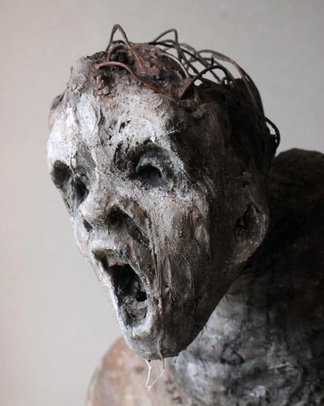 À ses côtés, Sylvie Cliche vous invite à la découverte de ses sculptures. Elle utilise des matériaux minéraux ou végétaux pour créer des œuvres à mi-chemin entre l’expressionnisme, l’art brut et l’art primitif, où le corps et le visage sont souvent très expressifs.
