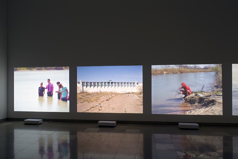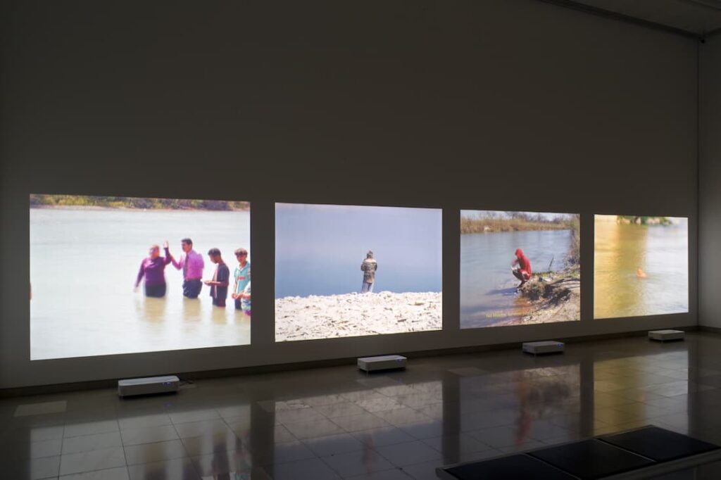 L’exposition du Carré d’Art présente le projet photographique Bravo décliné en trois chapitres distincts et une impressionnante œuvre audiovisuelle El Cruce. En toile de fond, la région du Rio Bravo, ce long fleuve qui sert de frontière entre le Mexique et les États-Unis, théâtre permanent de tensions géopolitiques et de drames humains. Le photographe capte les réalités physiques et sociales de cette frontière. Fixés par l’objectif sans artifices, les austères logements portent les traces d’une occupation transitoire précaire, les portraits dépouillés évoquent la lassitude, les paysages désolés ont un air de no man’s land. En contrepoint, dans l’immense fleuve, se jouent des scènes improbables : le baptême filmé en direct d’hommes et de femmes au milieu des eaux, un homme qui lave des vêtements sans doute abandonnés lors de traversées clandestines, un autre qui se baigne…Le fleuve, dont le cours se modifie au gré du mouvement des vannes du barrage qui retient ou libère les eaux, façonne le mode de vie des humains. En incorporant d’autres usages, l’artiste, sans pathos, détourne et déplace l’implacable condition de la frontière, qui devient une géographie qui appartient à la culture et au langage. Une fois transgressée, elle disparaît symboliquement.