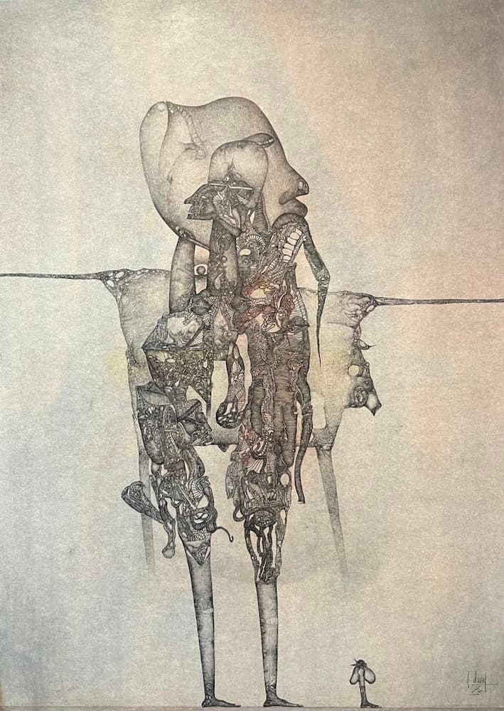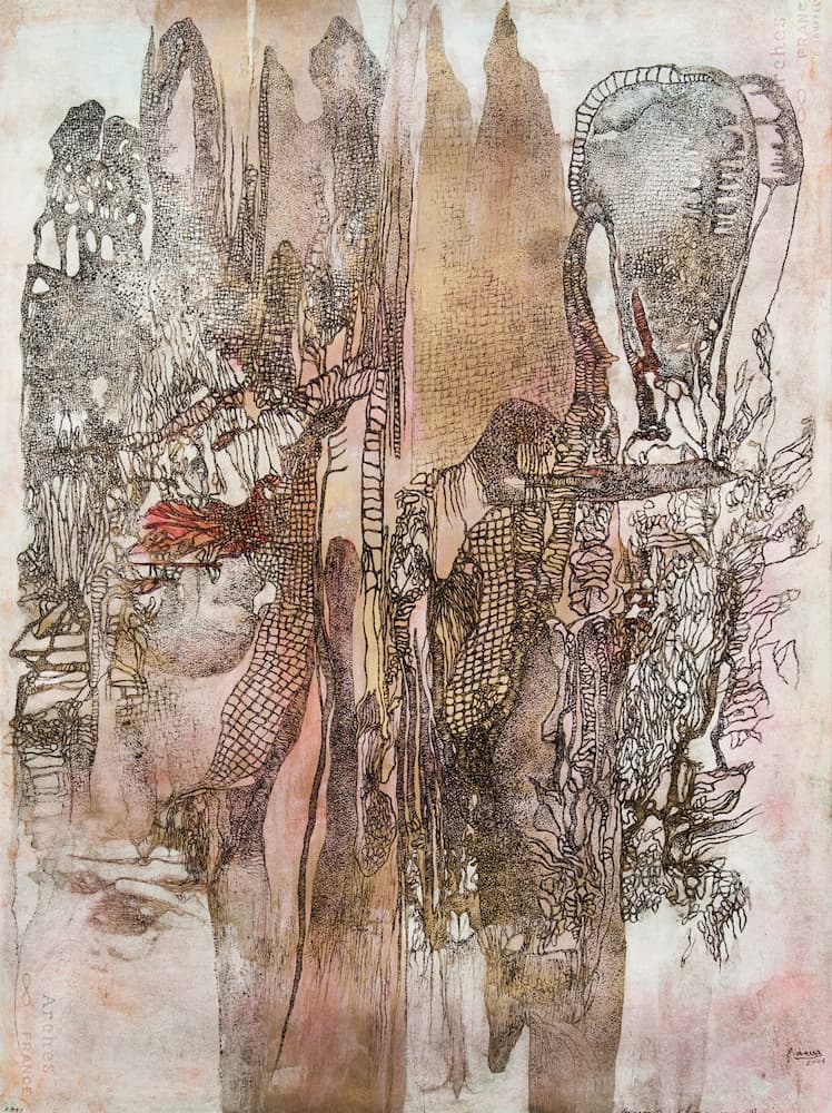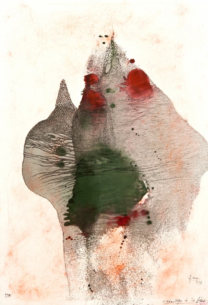 Des îles du dedans aux labyrinthes de la chair, se déploie souplement son territoire d’art. Son trait d’errance créatrice est aigu, cruel, infime, et d’une finesse incroyable creusée au scalpel. Et le corps d’altérité s’aventure dans les ailleurs du monde. Les forces agissantes ouvrent la voie, et se déploient dans la gravité, à la majestueuse allure de ses grands et petits formats. Fred Deux dessine de l’intérieur les abîmes de la chair, son cérémonial, ses avancées, ses ténèbres, et ses incongruités. En rituel inconnu, inactuel, possédé.
