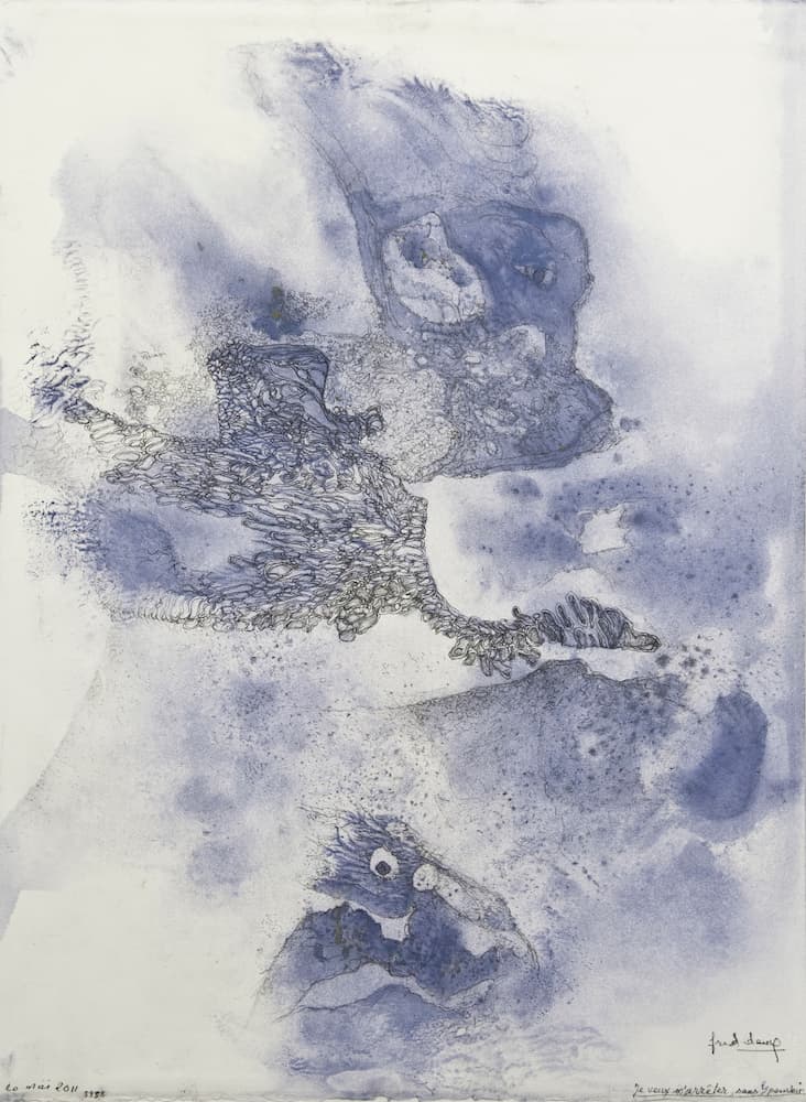 Fred Deux, qui sait aussi très bien écrire, impose un rituel inconnu, inactuel, possédé. Il n’y a pas de limites aux secrets du dedans. Son art est de perdre en soi, au plus près de l’unité cellulaire des corps, les surfaces du jour qui aveuglent, jusqu’au vertige final qui les installe. “Une géographie intérieure surgit, où veines, nerfs et viscères s’entre- lacent en méandres organiques explorant l’envers du vivant, chaque trait paraissant alors sonder les abîmes d’une mémoire enfouie » (Maud de la Forterie, Galerie Margaron).