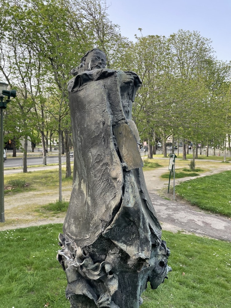 Sur l’une, Jean Moulin apparaît en médaillon avec écharpe et chapeau, environné d’une pluie de lettres en relief rappelant le chant des partisans. Autour des stèles, sur une minuscule colline, au cœur de Paris, l’espace est plus dense…