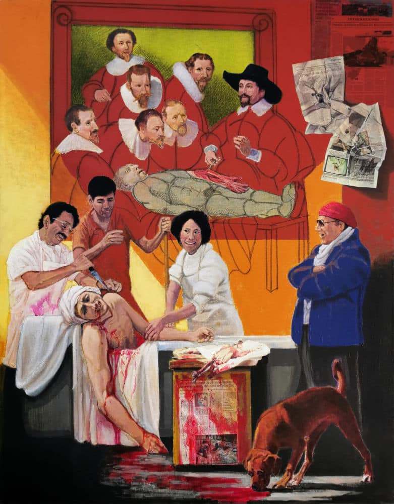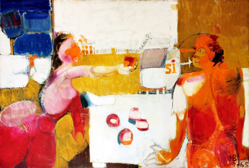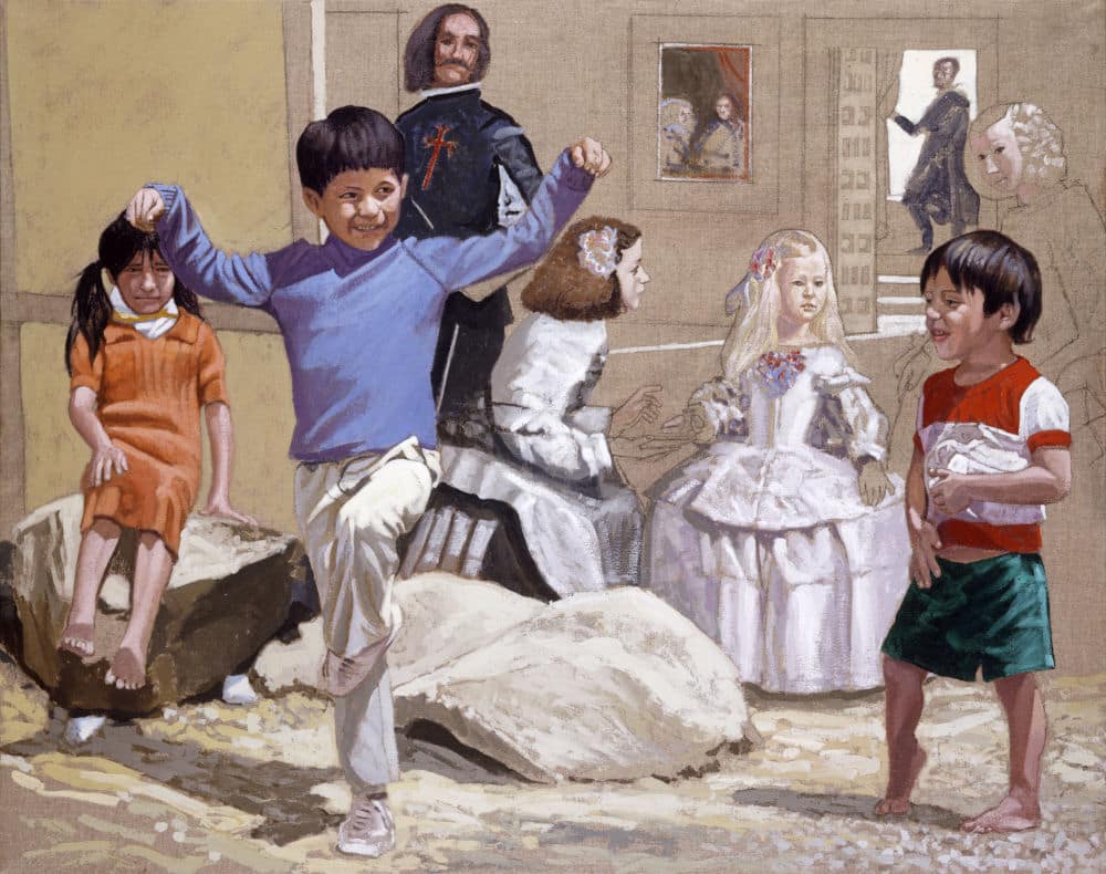 Chaque peinture ouvre les portes et les fenêtres du temps. Les grands personnages du passé, les maîtres d’art de l’artiste, de Goya à Picasso, ou de Vélasquez à Matisse, côtoient, dans une admirable galerie de portraits, ceux du présent, de Bacon à Arroyo, ses amis d’âme et de cœur. S’ajoutent des détails surréalisants qui perturbent une possible clarté de lecture. Peinture sans frontière mentale où l’artiste, intégrant toutes les données de la création picturale, plonge au profond de l’acte créatif, en faisant vive mémoire de tout ce qui l’a construit.