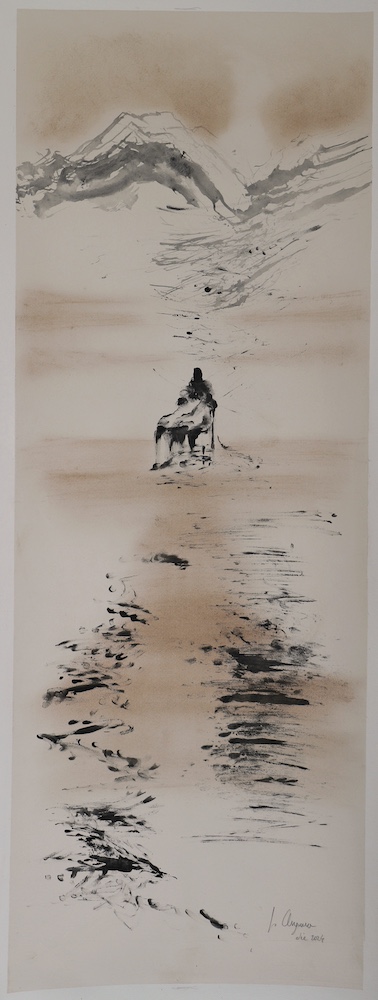 Les sculptures d’élévation de Jean Anguera accumulent du temps. Elles sont du temps-matière et du temps-univers. Des strates se surajoutent les unes aux autres, avec des entailles et des cicatrices. On dirait qu’elles partent du sol, et la terre est un socle pour le corps, le territoire d’art de ce sculpteur intemporel. Pour lui, toujours la même source : l’argile, qui a conservé la mémoire de ce qu‘elle a vécu. Lui sent et intègre cette dimension d’accumulation, avec seulement la vague et hasardeuse idée de la hauteur à atteindre. C’est l’œuvre qui décide, pas l’intellect. Et tout advient : les directions de l’espace, la nature masculine ou féminine de l’œuvre, ses dimensions, son aura de pure présence. Jean Anguera n’agresse jamais l’espace, il l’incante. Ainsi la terre parle une langue oubliée des hommes. Et quand il s’adonne à la peinture, le sens du vide et la vastitude le rapprochent intensément de la Chine.