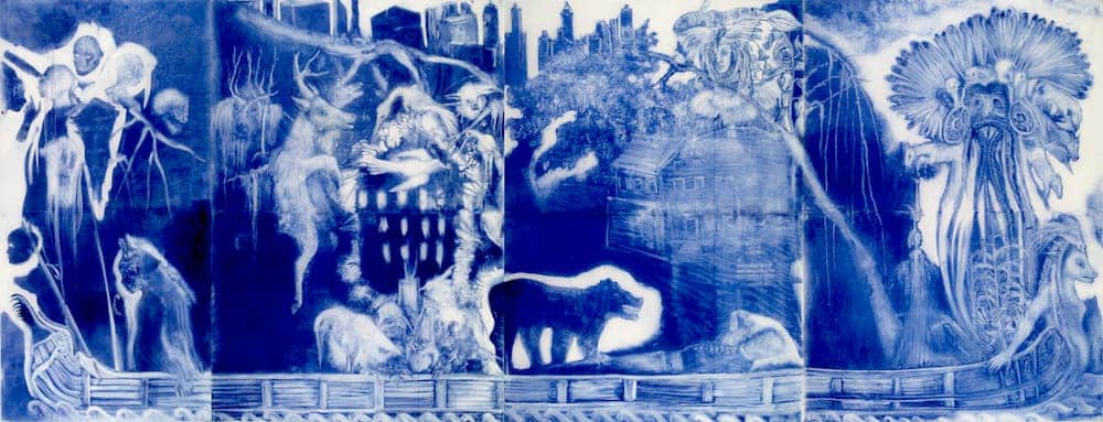 L’œuvre du Suisse Ficht Tanner occupe une bonne place dans l’exposition. Originaire de l’Appenzell en Suisse, région de renommée mondiale pour ses riches traditions de broderies de luxe réalisées à la main aux XVIIIème et XIXème siècles, cet artiste multiforme, à la fois brodeur, dessinateur, musicien et chanteur folklorique de L’Appenzell, arpente avec sa compagne Thérèse les multiples possibilités de l’art textile. Ses dessins et broderies regorgent de formes organiques et cosmogoniques vibrantes de couleurs, tandis que Thérèse confectionne des patchworks à partir de tissus précieux.